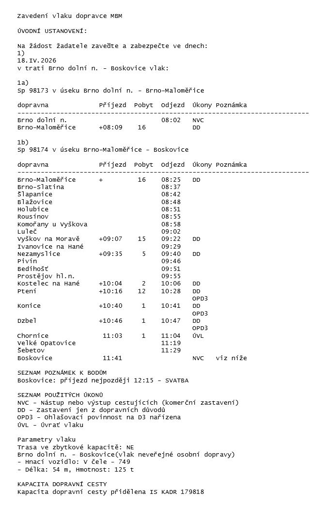 Ve středu 15. dubna jsme konečně dostali jízdní řád (je uveden dole na stránce) a SŽ po nás požaduje dřívější odjezd (oficiálně už v 8:02, ale to zřejmě nemůžeme stihnout). Pokuste se proto prosím na nádraží doarzir raději dřív než v 8:30, protože to bude opravdu, skutečně a neodkladně poslední možnost nastoupit do vlaku, který pak hned odjede!